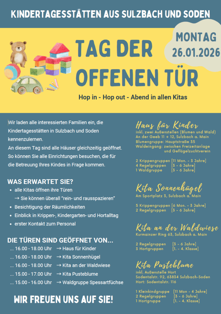 Am 26.01.2026 öffnen alle Kitas in Sulzbach und Soden ihre Türen für interessierte Familien.